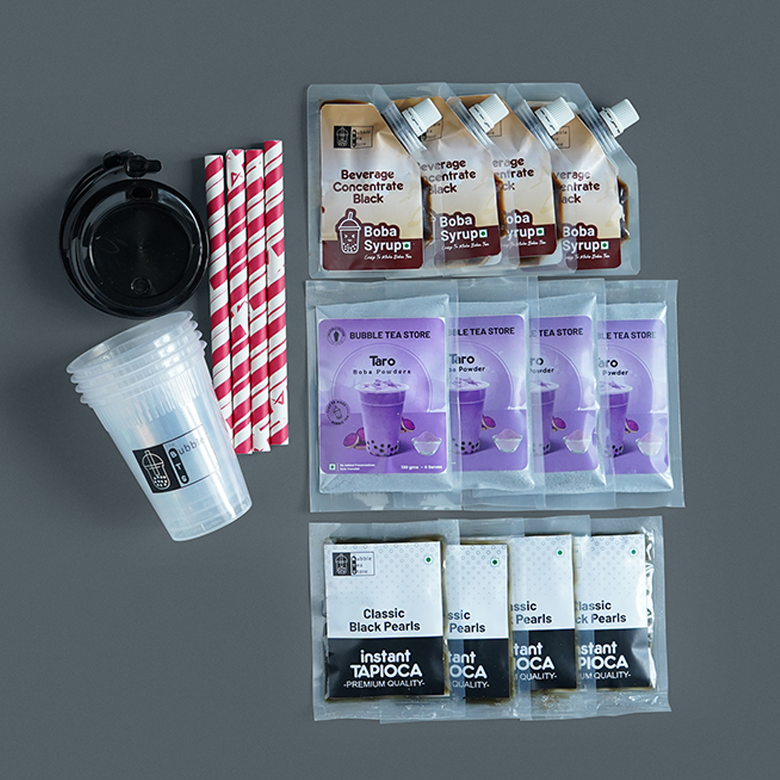 Includes 4x Taro Mix (50g), 4x Instant Tapioca Pearls (50g), 4x Brown Sugar Syrup (50ml), 4 Reusable Plastic Cups, and 4 Disposable Paper Straws.
